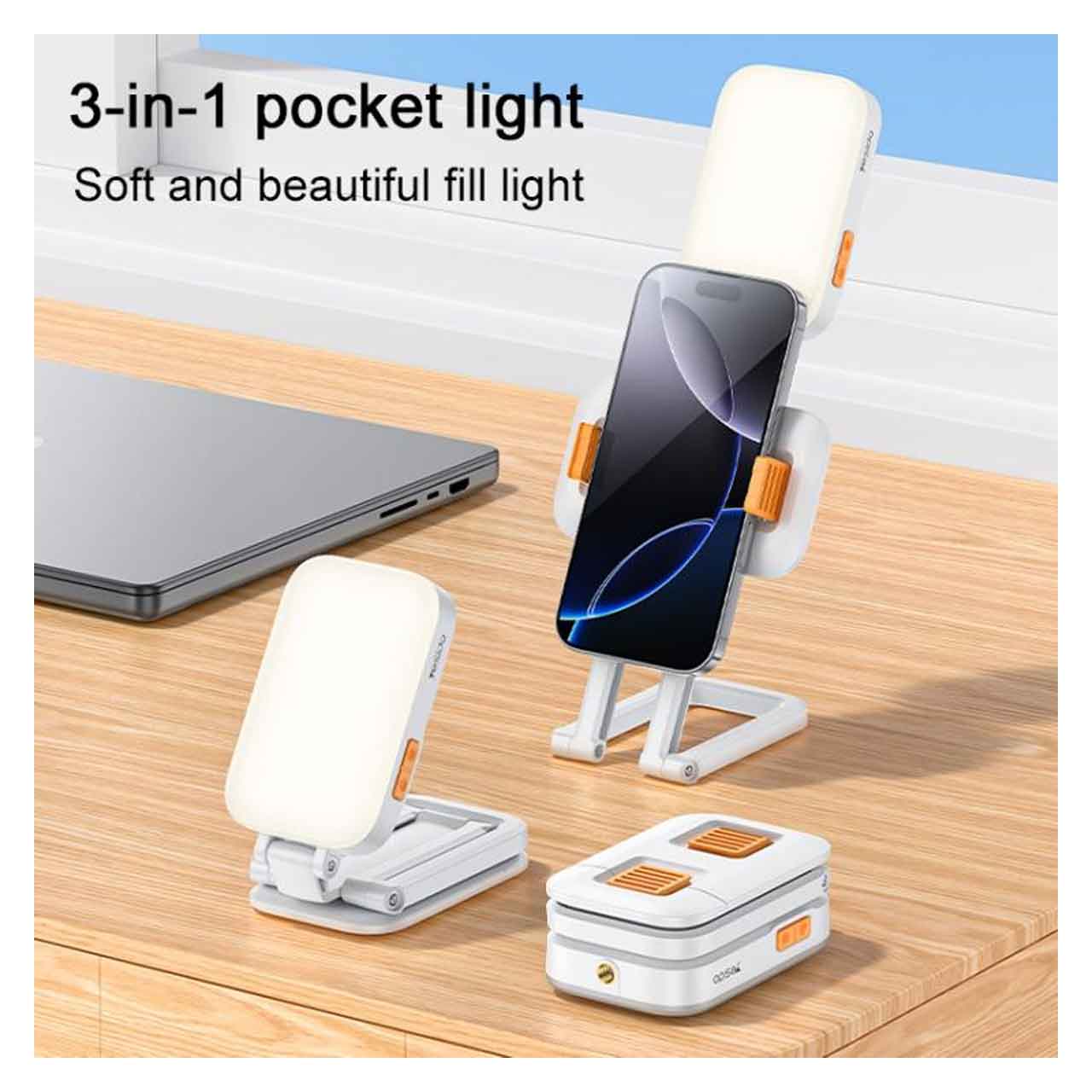 طراحی چندمنظوره ۳ در ۱: هولدر موبایل، رینگ لایت سلفی و پایه رومیزی تاشو.