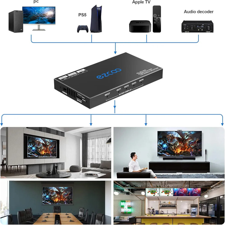دستگاه پخش همزمان یک تصویر روی چهار تلویزیون برند ایزکو (EZCOO One to Four HDMI Splitter)، دقیقاً همان معجزه سختافزاری است که یک خروجی تصویر (مانند کیس کامپیوتر، گیرنده دیجیتال یا دستگاه ضبط دوربین مداربسته) را دریافت کرده و آن را در کسری از ثانیه روی چهار نمایشگر مجزا با بالاترین شفافیت ممکن تکثیر میکند.