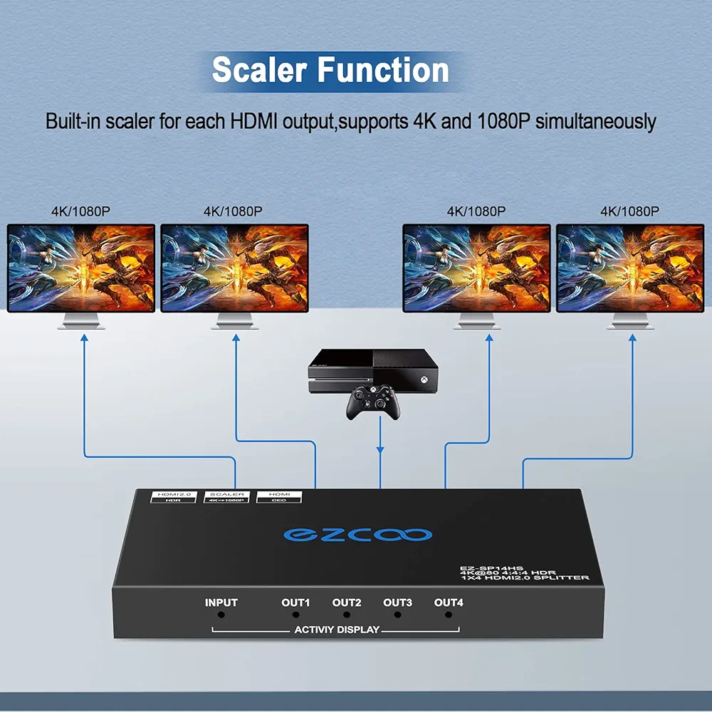 دستگاه پخش همزمان یک تصویر روی چهار تلویزیون برند ایزکو (EZCOO One to Four HDMI Splitter)، دقیقاً همان معجزه سختافزاری است که یک خروجی تصویر (مانند کیس کامپیوتر، گیرنده دیجیتال یا دستگاه ضبط دوربین مداربسته) را دریافت کرده و آن را در کسری از ثانیه روی چهار نمایشگر مجزا با بالاترین شفافیت ممکن تکثیر میکند.