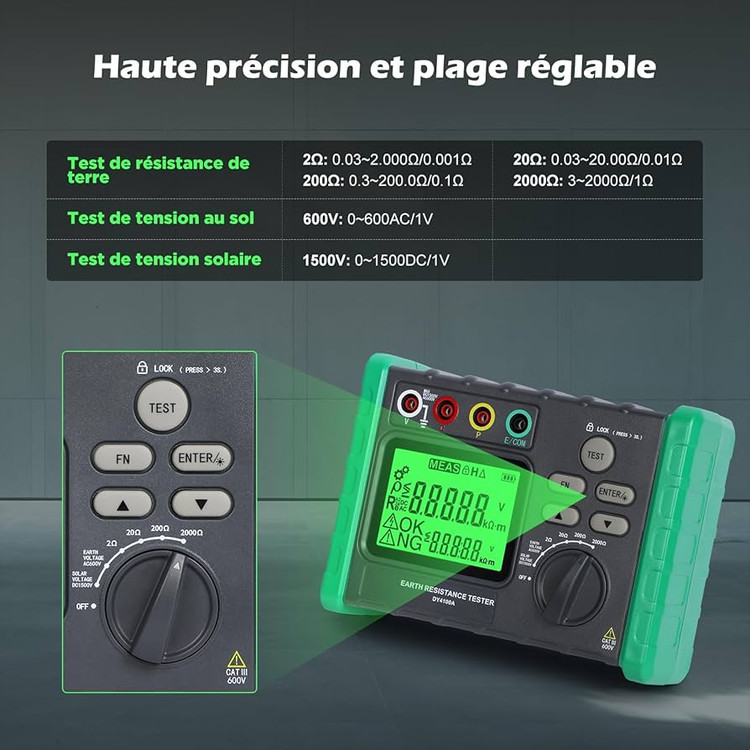 یکی از ویژگیهای برجسته این ارت تستر دیجیتال KAISAL، توانایی سنجش همزمان ولتاژهای AC و DC است. این دستگاه میتواند ولتاژ AC تا سقف ۶۰۰ ولت و ولتاژ DC تا سقف ۱۵۰۰ ولت را اندازهگیری کند. این قابلیت آن را به یک ابزار چندمنظوره برای تکنسینهای برق صنعتی تبدیل میکند که علاوه بر بررسی سیستم ارتینگ، میتوانند ولتاژ شبکه، پنلهای برق و حتی سیستمهای فتوولتائیک (پنلهای خورشیدی) را نیز بررسی کنند.