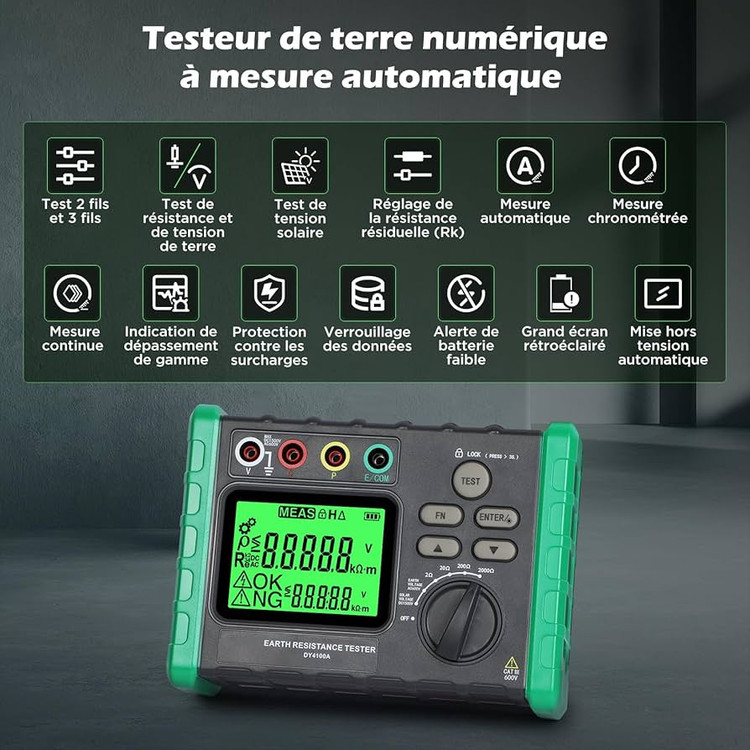اگر به دنبال خرید تستر مقاومت زمین KAISAL DY4100A هستید، این دستگاه بهترین انتخاب برای مهندسان برق و تکنسینهای صنعتی است. این ارت تستر دیجیتال KAISAL با قابلیت اندازهگیری دقیق از ۲ تا ۲۰۰۰ اهم، یک دستگاه اندازهگیری مقاومت ارت حرفهای محسوب میشود. استفاده از میگر مقاومت زمین چهار سیمه دقت بسیار بالایی را تضمین میکند. این تستر ولتاژ AC و DC دیجیتال میتواند ولتاژهای تا