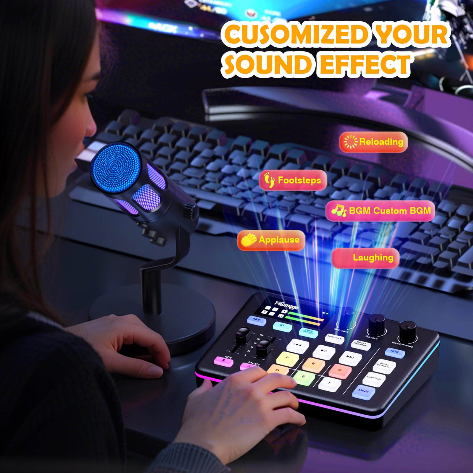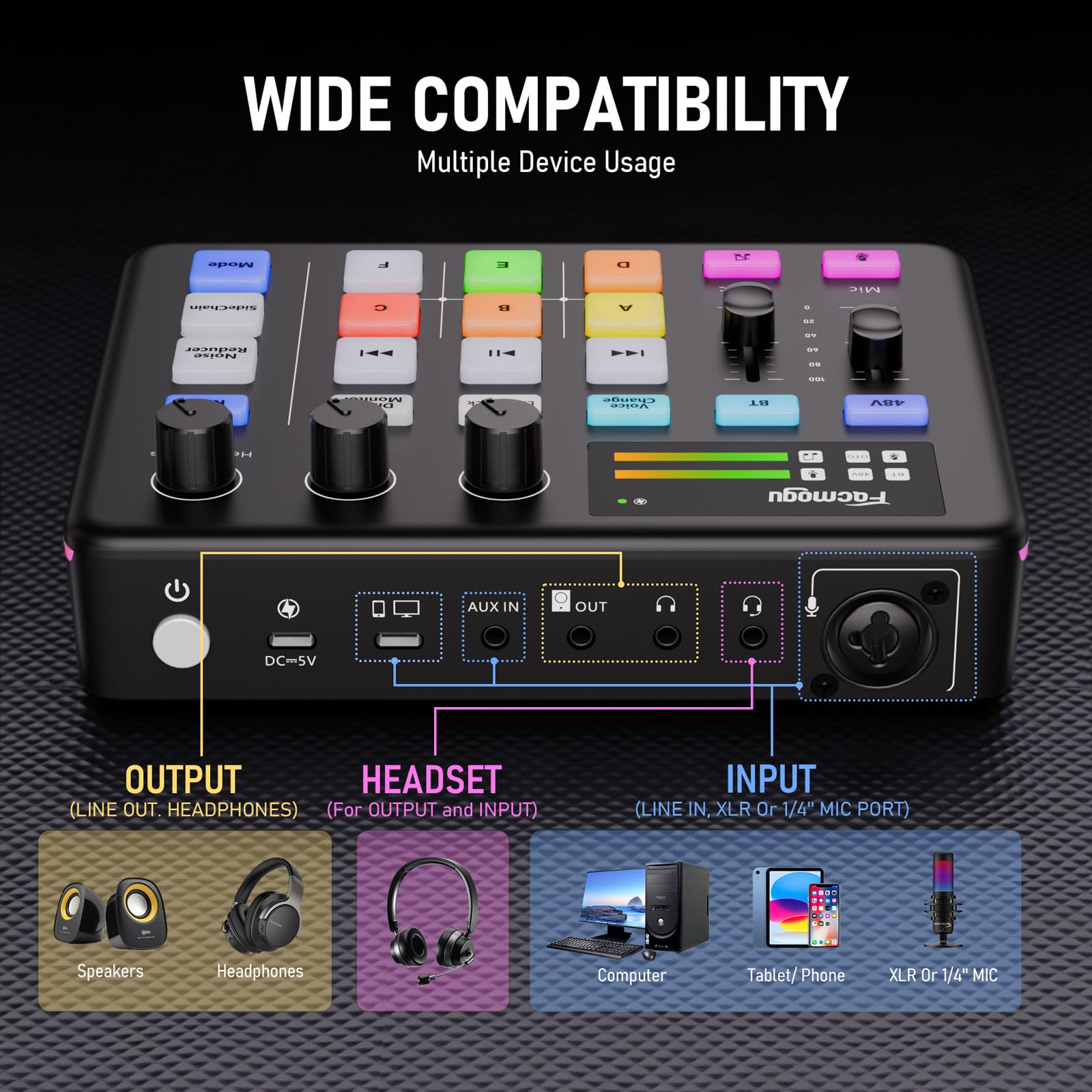 کارت صدای استریم Facmogu - میکسر صوتی با افکتهای صدا، فانتوم پاور 48V و بلوتوث