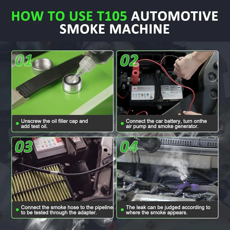 نشتیهای ریز در سیستم EVAP یا ورودی هوا اغلب با روشهای سنتی قابل تشخیص نیستند و تکنسین را مجبور به بررسی تکتک اتصالات و لولهها میکنند. دودساز حرفهای T105 با تزریق دود به سیستم، نشتی را بهصورت بصری نمایان کرده و دقیقاً مشخص میکند کدام قطعه یا اتصال مشکل دارد. فشارسنج یکپارچه روی دستگاه وضعیت فشار سیستم را در لحظه نمایش میدهد و به تکنسین امکان میدهد شدت نشتی را ارزیابی کند.