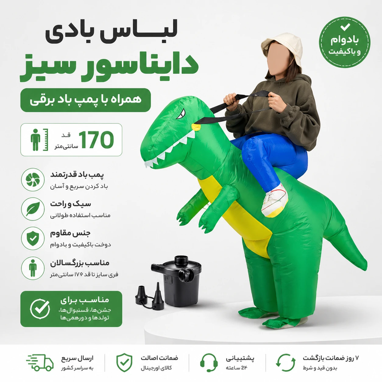 اگر به دنبال لباسی هستید که در جشنها و مهمانیها سریعاً جلب توجه کند و فضای شاد و متفاوتی بسازد، لباس دایناسور بادی بزرگسالان با طراحی سبز، وزن سبک، کمر کشی Free Size و پمپ باد همراه، گزینهای کاربردی و سرگرمکننده برای شماست.