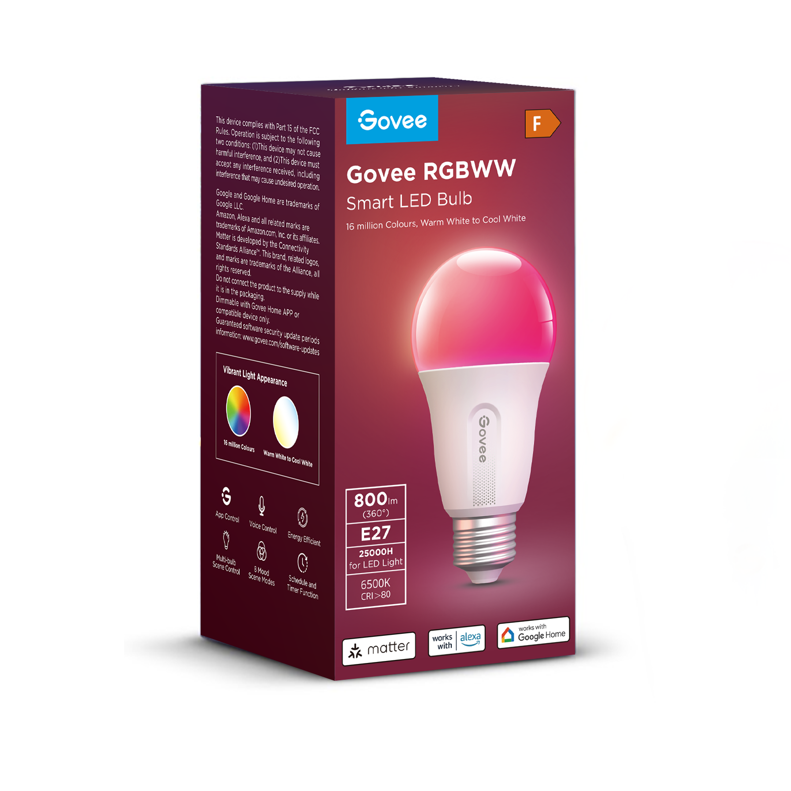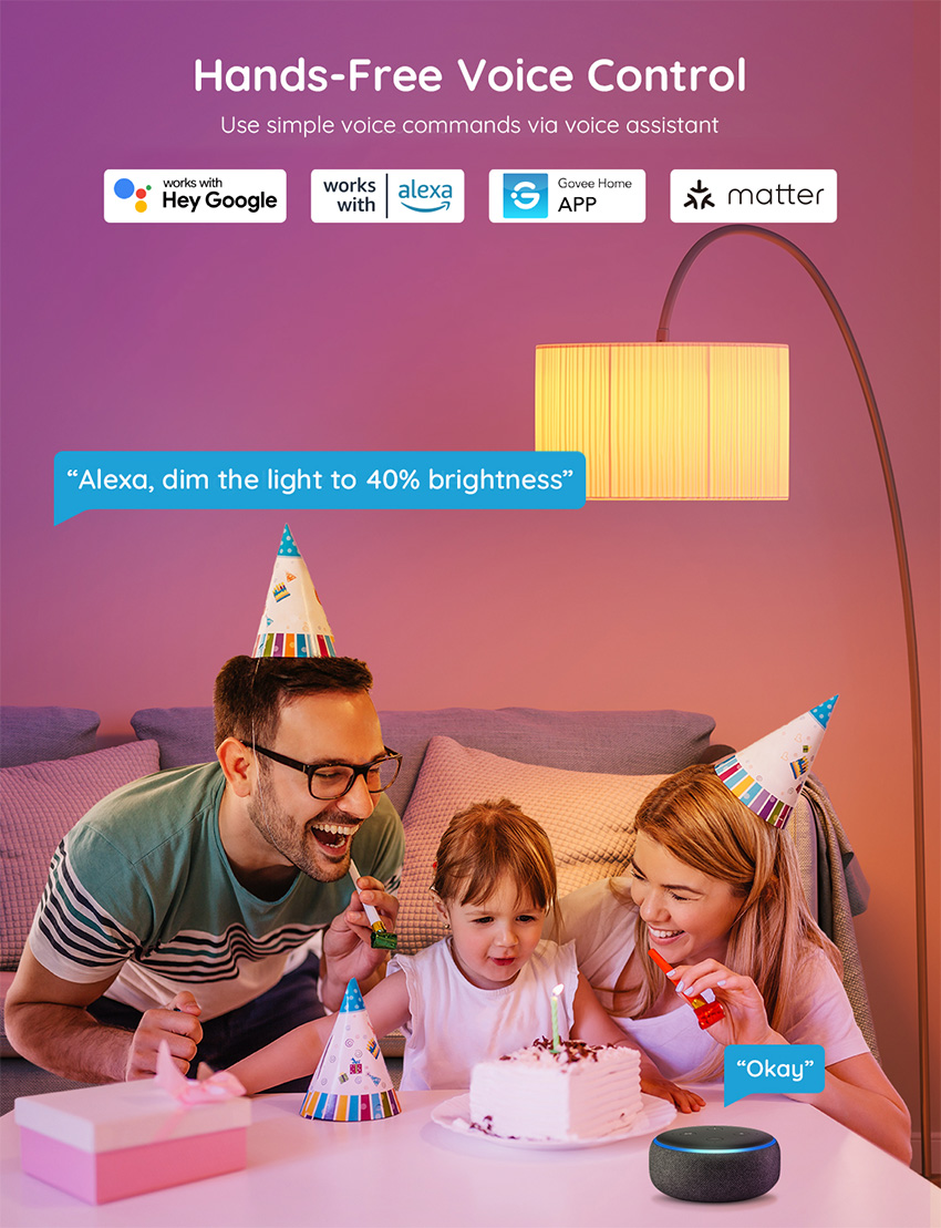 | کنترل هوشمند | روشن/خاموش، تنظیم روشنایی، تغییر رنگ و تنظیم صحنه از طریق برنامه Govee Home |