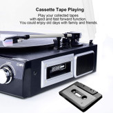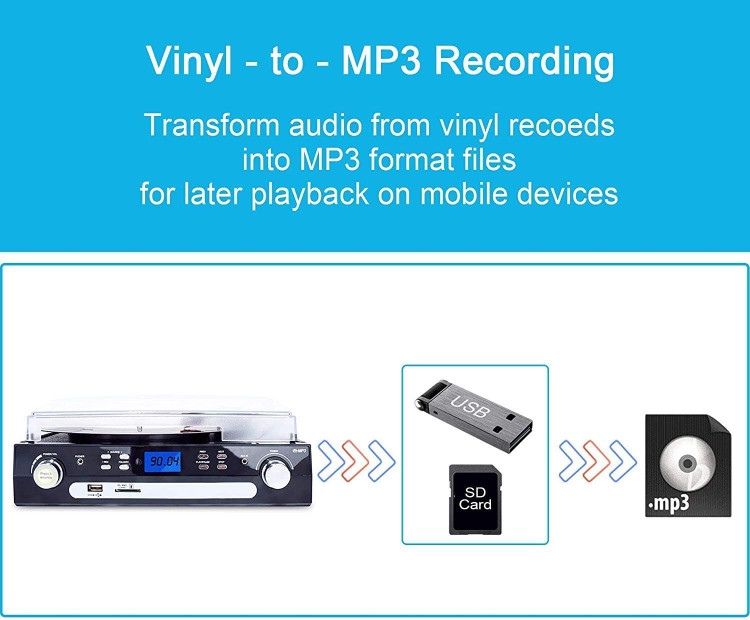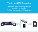 یکی از برجستهترین قابلیتهای این گرامافون، تبدیل مستقیم صفحات وینیل به فرمت MP3 بر روی فلش USB یا کارت SD است، بدون نیاز به کامپیوتر یا نرمافزار اضافی. علاوه بر این، این دستگاه یک پلیر کاست با قابلیتهای خروج و جلوبرانی سریع دارد و با ورودی AUX، اتصال دستگاههای دیگر همچون CD پلیر و آیپاد هم فراهم میشود.