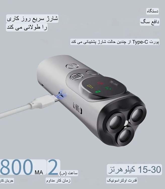 - طراحی سهکاناله: این دستگاه قادر است همزمان با ارسال سیگنالهای اولتراسونیک، تاثیرگذاری بیشتری در دور کردن سگها و حیوانات ایجاد کند.